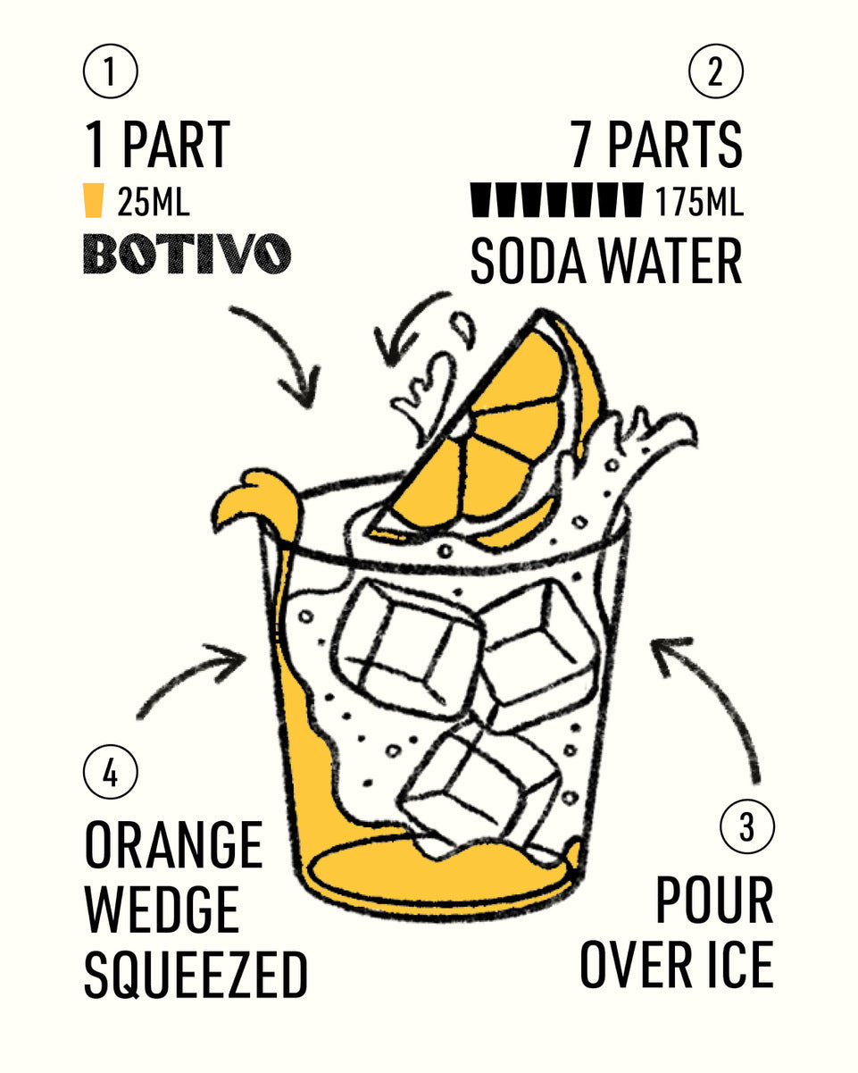 Serve 25ml (1 part) Botivo to 175ml (7 parts) soda over ice with a juicy wedge of orange.
